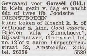 Op 7 november 1941 werd in Het Joodsche Weekblad een advertentie geplaatst waarin één of twee Joodse dienstboden gevraagd werden voor villa ‘Zonnehoeve’ in Gorssel. Men kon zich aanmelden op dit adres, waar in die tijd het gezin Eisemann woonde. Het gezin bestond uit koopman Ernst Jakob Eisemann (Meckerheim, – Sobibor, ), zijn echtgenote Ilse Sophie Zuckermann (Hamburg, – Sobibor, ) en hun kinderen Renate (Hamburg, – Sobibor, ) en Harald (Amsterdam, – Sobibor, ). Het gezin werd op 3 september 1942 in Westerbork geregistreerd en op 25 mei 1943 gedeporteerd naar Sobibor.