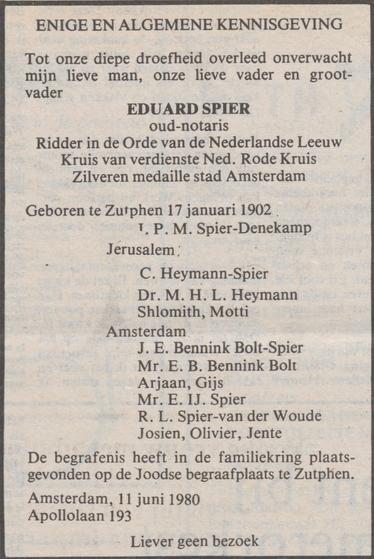Eduard Spier (Zutphen, 17 januari 1902 – Amsterdam, 11 juni 1980), zoon van Isedore Spier (Zutphen, – Amsterdam, ) en Selina Elias (Strijp, – Utrecht, ), was notaris. Hij was gehuwd met Jacoba Paulina Martha Denekamp (Delft, 30 december 1909) en had met haar drie kinderen; Celine, Janna Elisabeth en Eduard Ysbrant. Het gezin woonde op de Waldeck Pyrmontlaan 12hs.