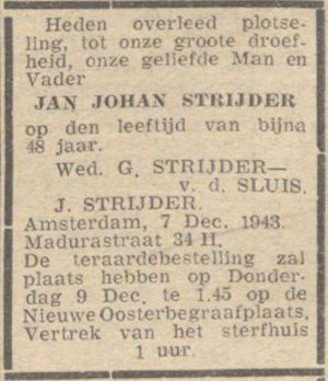 “Familiebericht”. “De courant Het nieuws van den dag”. Amsterdam, 08-12-1943. Geraadpleegd op Delpher op 19-11-2018, https://resolver.kb.nl/resolve?urn=ddd:010330684:mpeg21:a0040.