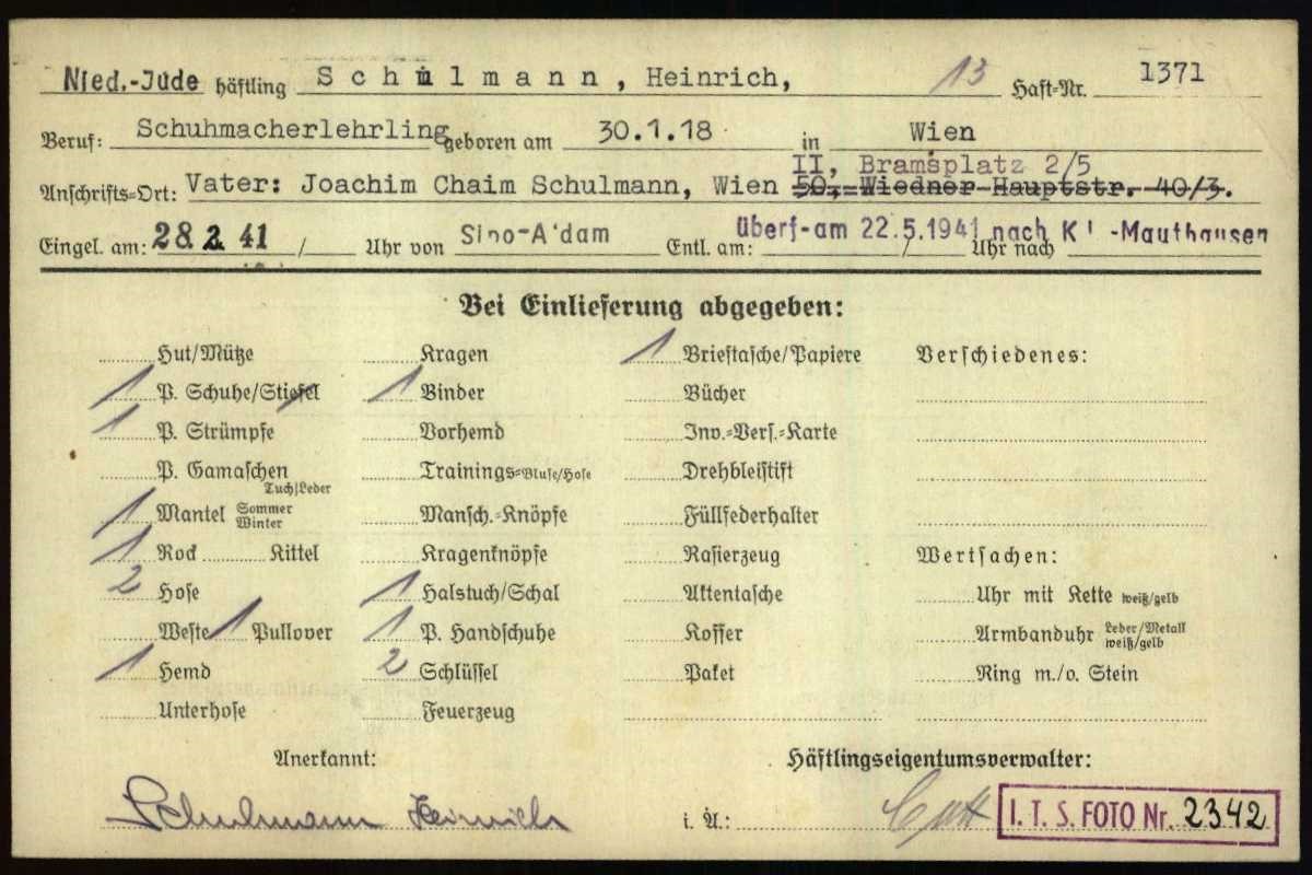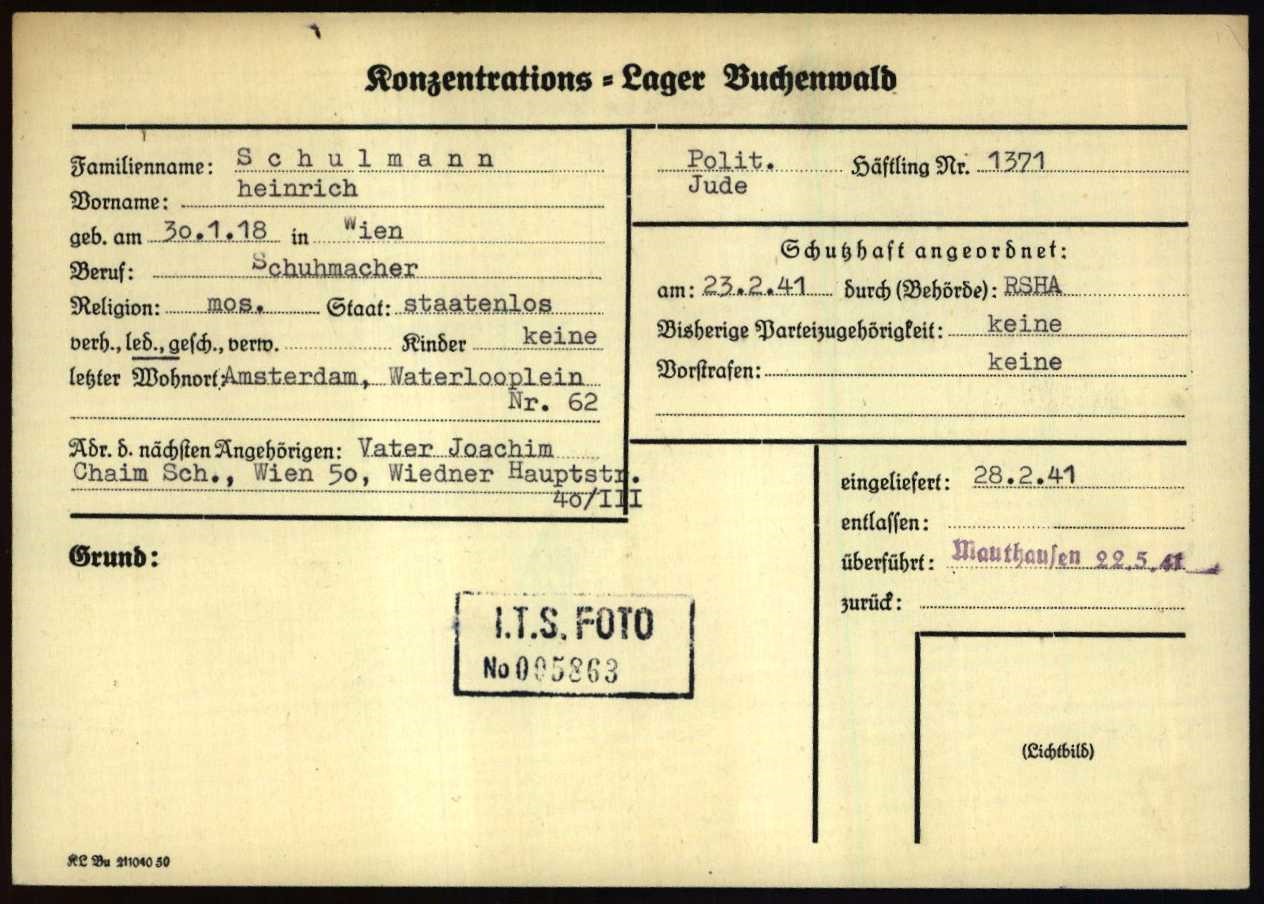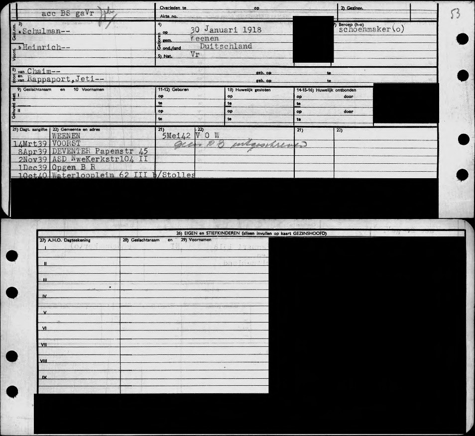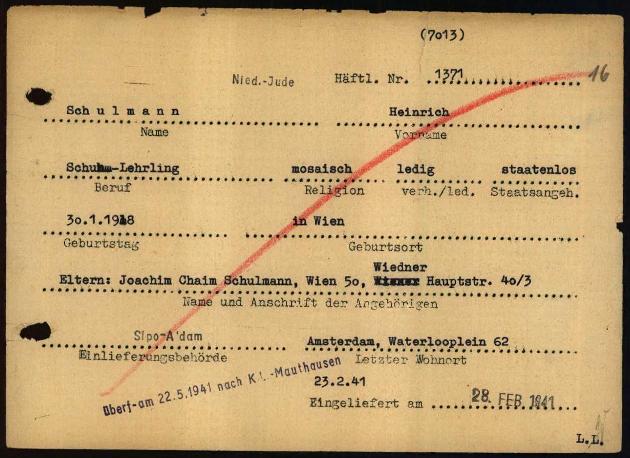 | De naam van Heinrich Schulmann is opgedoken na de publicatie van het boek De razzia’s van 22 en 23 februari 1941 in Amsterdam; het lot van 389 Joodse mannen en Heinrich is niet in dit boek besproken. |