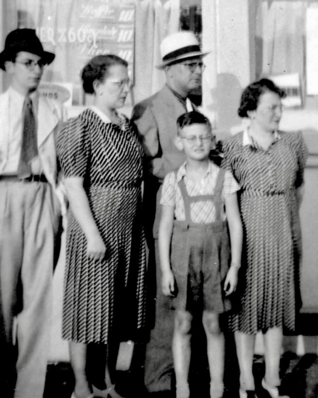 Heinrich Schulmann (links) met familie in Amsterdam. Naast hem staan zijn tante Tini Rappaport, oom Milo Rappaport, neef Heinz en de zus van Tini, Leni Zwillich. Augustus 1939. © Yad Vashem.