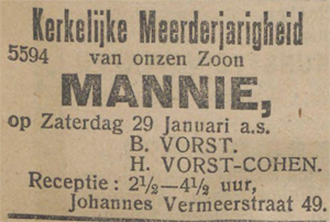 Mannie Abram Bernard Vorst werd op 18 januari 1908 geboren in Amsterdam. Hij werd op 29 januari 1921 Bar Mitswa (kerkelijk meerderjarig). Op 14 november 1933 trouwde hij met Celine Helena Asscher (Amsterdam, 18 november 1911), hij scheidde van haar op 6 april 1939. Celine en Mannie hadden twee kinderen; Helena Henriëtte (Amsterdam, 5 oktober 1934) en Bernard Abraham Mannie (Amsterdam, 18 juli 1936). Tijdens de oorlog was Mannie secretaris van de voorzitter van de Joodsche Raad. In die tijd woonde Mannie op het Krugerplein 24-1. Mannie was de zoon van Benjamin Vorst (Culemborg, 13 oktober 1874 – Amsterdam, 11 maart 1938) en Henriëtte Cohen (Rotterdam, 3 februari 1875 – Amsterdam, 10 december 1940).