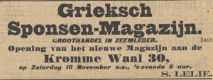 Op 16 november 1907 opende Simon Lelie (Amsterdam, 30 januari 1839) hier zijn zaak in sponzen en zemen, volgens het Nieuw Israëlietisch Weekblad ‘het grootste sponzenmagazijn van ons land’. Voor deze datum was de zaak op Kromme Waal 37 gevestigd. Op 15 november 1908 overleed zijn echtgenote, Heintje Polak (26 december 1833). Simon en Heintje hadden zes kinderen.