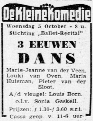 “Nederlands Ballet start op 6 October Met twaalf solisten en corps de ballet van een en twintig Vorming van klassiek repertoire — werk met buitenlandse choreografen”. “Algemeen Handelsblad“. Amsterdam, 01-10-1954. Geraadpleegd op Delpher op 27-07-2017, http://resolver.kb.nl/resolve?urn=KBNRC01:000041323:mpeg21:a0167.