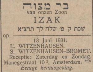 Op 13 juni 1931 vierder Isaac Witzenhausen zijn Bar Mitswa (kerkelijk meerderjarig). Isaac was een zoon van Sara Bromet (Amsterdam,
