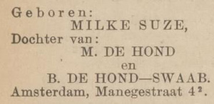 Milka Suze de Hond, Familiebericht. “Centraal blad voor Israëlieten in Nederland”. Amsterdam, 26-03-1936, p. 4. Geraadpleegd op Delpher op 26-06-2023, https://resolver.kb.nl/resolve?urn=MMKB19:000582057:mpeg21:p00004.