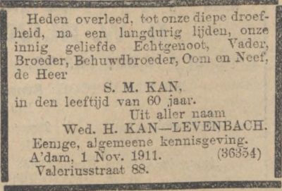 Salomon Kan, Familiebericht. “Algemeen Handelsblad”. Amsterdam, 02-11-1911, p. 3. Geraadpleegd op Delpher op 21-06-2025, https://resolver.kb.nl/resolve?urn=ddd:010340137:mpeg21:p003.